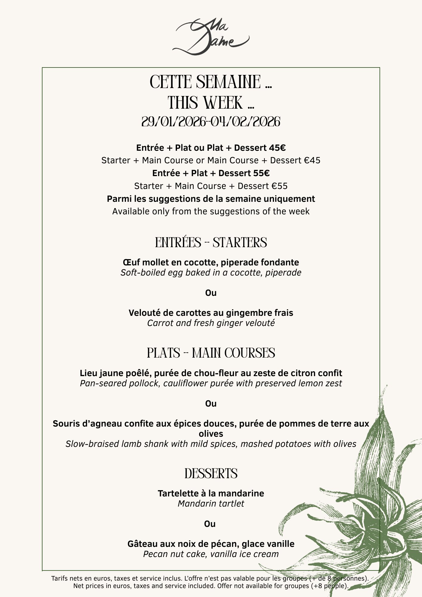 Ma Dame, est un restaurant feutré, un lieu unique à Paris, en plein coeur du 8e, entre l'Avenue Montaigne et les Champs-Elysées.